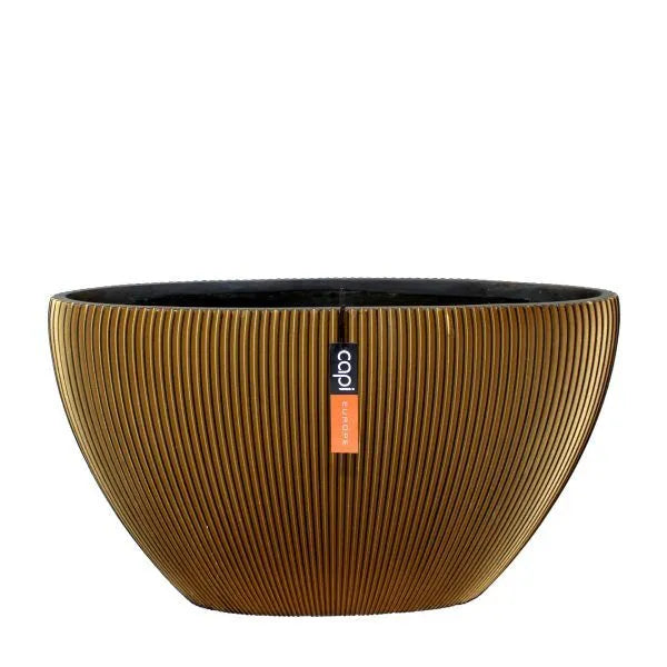 De Groove Black & Gold collectie is, zoals de naam al zegt, geïnspireerd op groeven. Vooral op de verticale groeven in stenen en bergen die zijn ontstaan in de loop van de jaren. Een collectie geïnspireerd op grote veranderingen van de natuur. Een speelse en stoere collectie binnen onze indoor nature-lijn. De Nature Groove collectie is handgemaakt, waardoor elke pot uniek is. De gouden kleur geeft deze textuur een warme, maar ook luxe look. Een echte eyecatcher bij jou thuis.