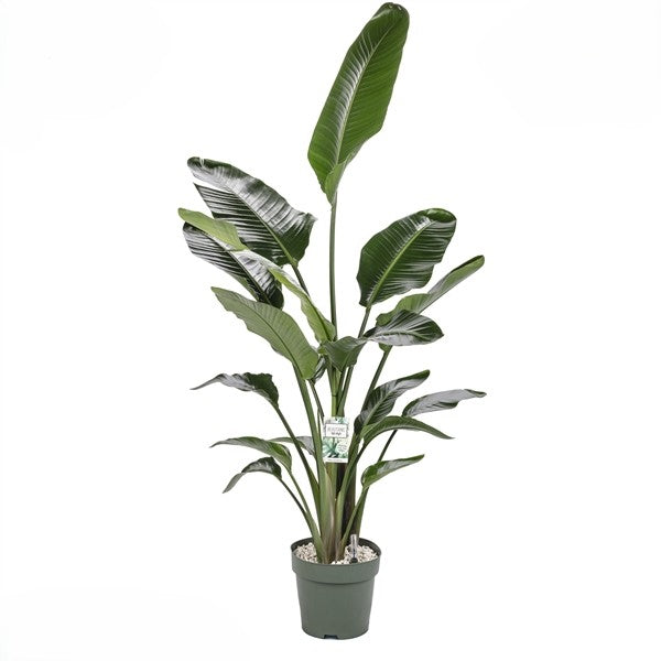 De Strelitzia nicolai, oftewel de "Giant White Bird of Paradise," is een imposante tropische plant die je interieur transformeert met haar grote, waaiervormige bladeren en statige uitstraling. Ze brengt een zuidelijke, exotische sfeer en is een blikvanger in elke ruimte. Ondanks haar grote formaat is ze verrassend eenvoudig te verzorgen, mits je haar de juiste omstandigheden geeft.